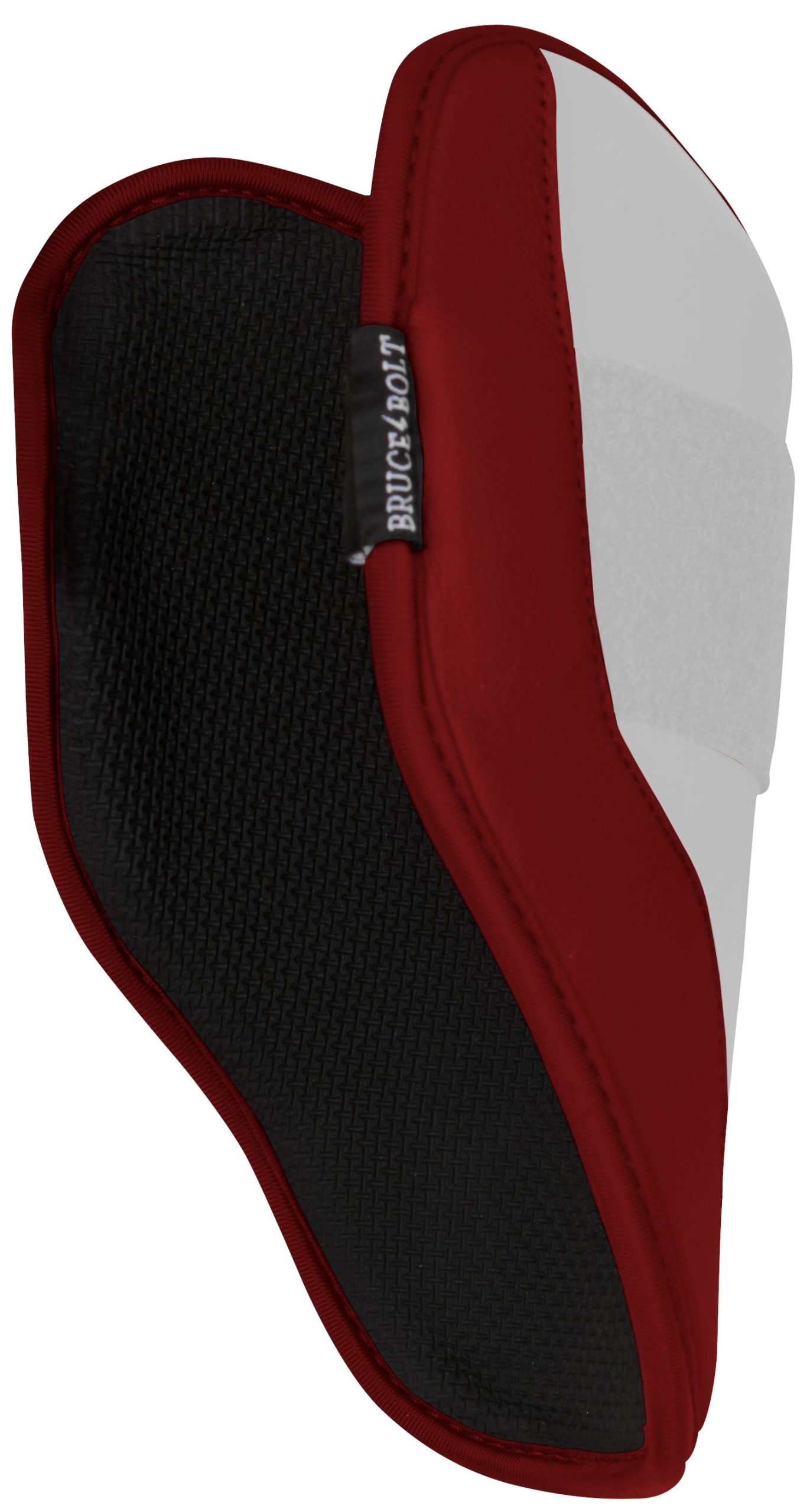 BRUCE BOLT’s PREMIUM PRO Elbow Guards feature a semi-moldable thermoplastic protective shell with a Cabretta leather outer and proprietary Sharkskin inner to prevent movement during the swing. 2 wide removable elastic strap locks the elbow guard in place providing maximum protection at the plate.